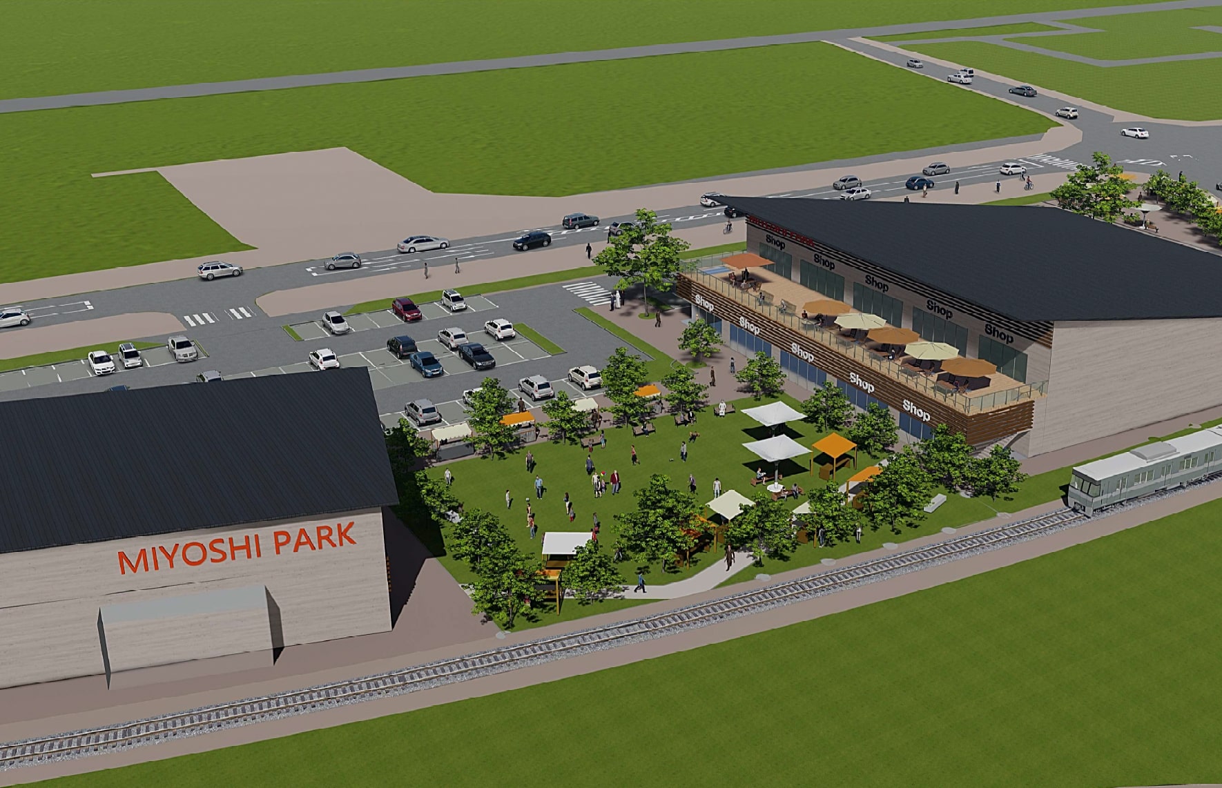 施設は、①スーパーと生活雑貨店の生活利便施設棟、②多様なテナントが集まる長屋棟、③日本一のファーストフード店舗 の3棟で構成されており、御代志エリアの心地よい空間として、「地域のみなさまに親しんでいただきたい」との想いを込めて、『SPring Garden MIYOSHI』と名付けました。この施設が御代志のランドマークとしてみなさまに親しまれるとともに、生活に欠かせない場所として地域に根づき、まちの魅力度向上の一翼を担っていくことを願っています。